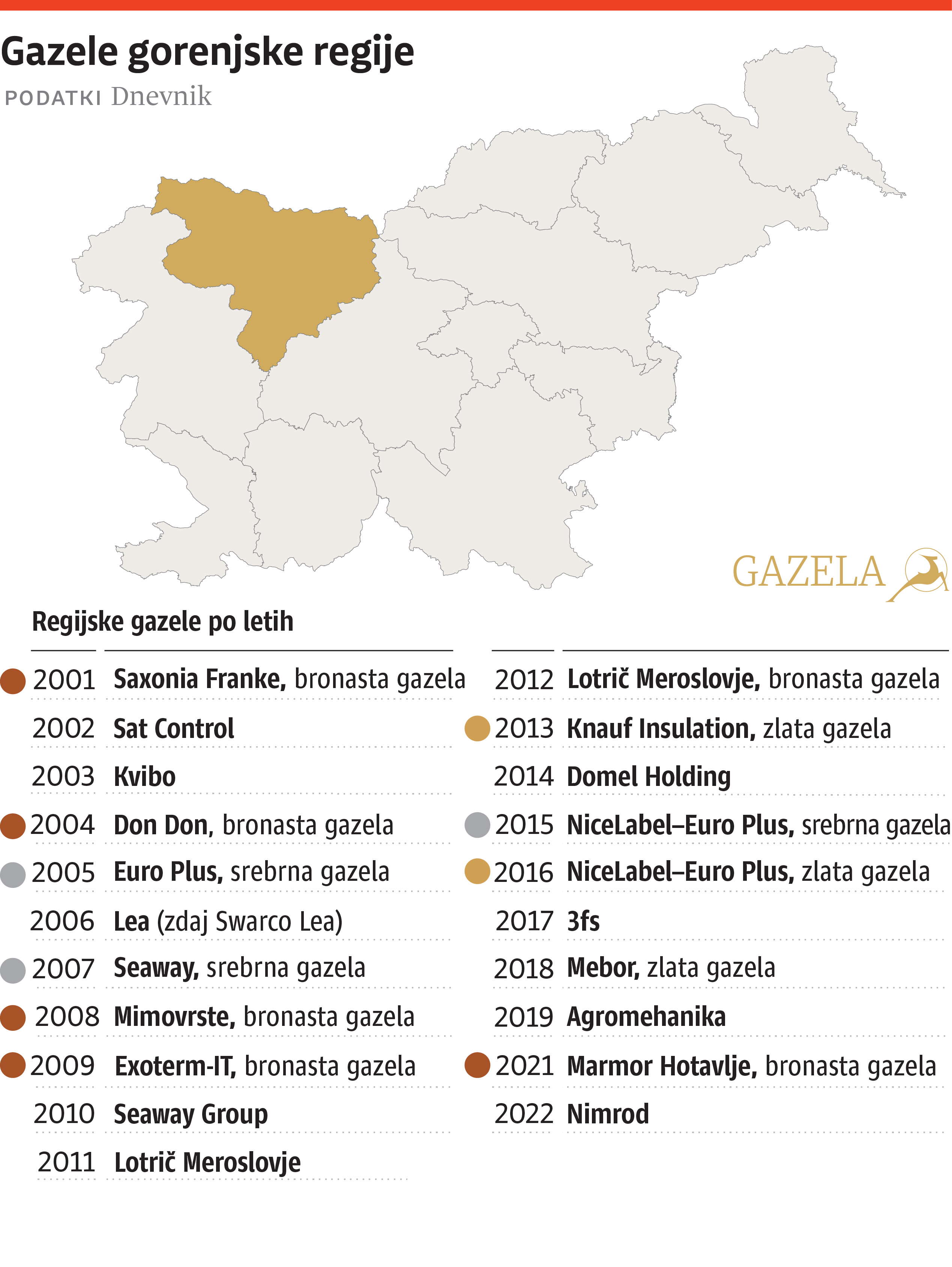 Metodološka komisija Gazele je za regijskega zmagovalca in prejemnika naziva gazela gorenjske regije izbrala podjetje Nimrod, ki raste gazelje hitro. Četrt stoletja staro družinsko podjetje, katerega vodenje je v rokah druge generacije, je na trgu postavljeno kot eden največjih ponudnikov divjačine v Evropi. Žene ga trajnostno naravnano poslanstvo, da z odkupom odstreljene divjadi omogoča razvoj lovske dejavnosti, kupcem pa nakup kakovostnega mesa in mesnih izdelkov iz divjačine. S svojim poslovnim modelom je Nimrod zgled krožnega gospodarstva. Po načelih trajnostnega voditeljstva jim je uspelo oblikovati poslovni ekosistem, ki presega običajne meje delovanja podjetij. Ta upošteva vse člene vrednostne verige ter njihove procese, odnose in sheme ter na ta način optimira možnosti za rast sistema in ne le njegovih posameznih delov. Ob prejemu priznanja je direktor Kristjan Hlede povedal, da je občutek fantastičen, potem pa se je zahvalil najprej zaposlenim in nato še družini, predvsem soprogi, ki prenaša, da ga nikoli ni doma, se je pošalil.