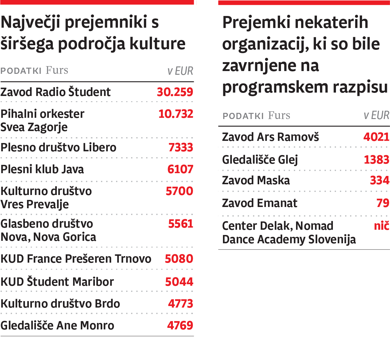 Nevladnih kulturnih organizacij med njimi pravzaprav ni – z izjemo nekaj zavodov, ki imajo v svojem uradnem nazivu tudi besedo »kultura«, vendar so v osnovi izobraževalne ali pa verske organizacije, ne pa poklicni producenti kulturnih in umetniških vsebin. Prvo »pravo« kulturno društvo se na lestvici pridobljenih sredstev nahaja šele okoli stotega mesta – to je Pihalni orkester Svea Zagorje, ki je lani iz dohodnine dobil 10.732 evrov.