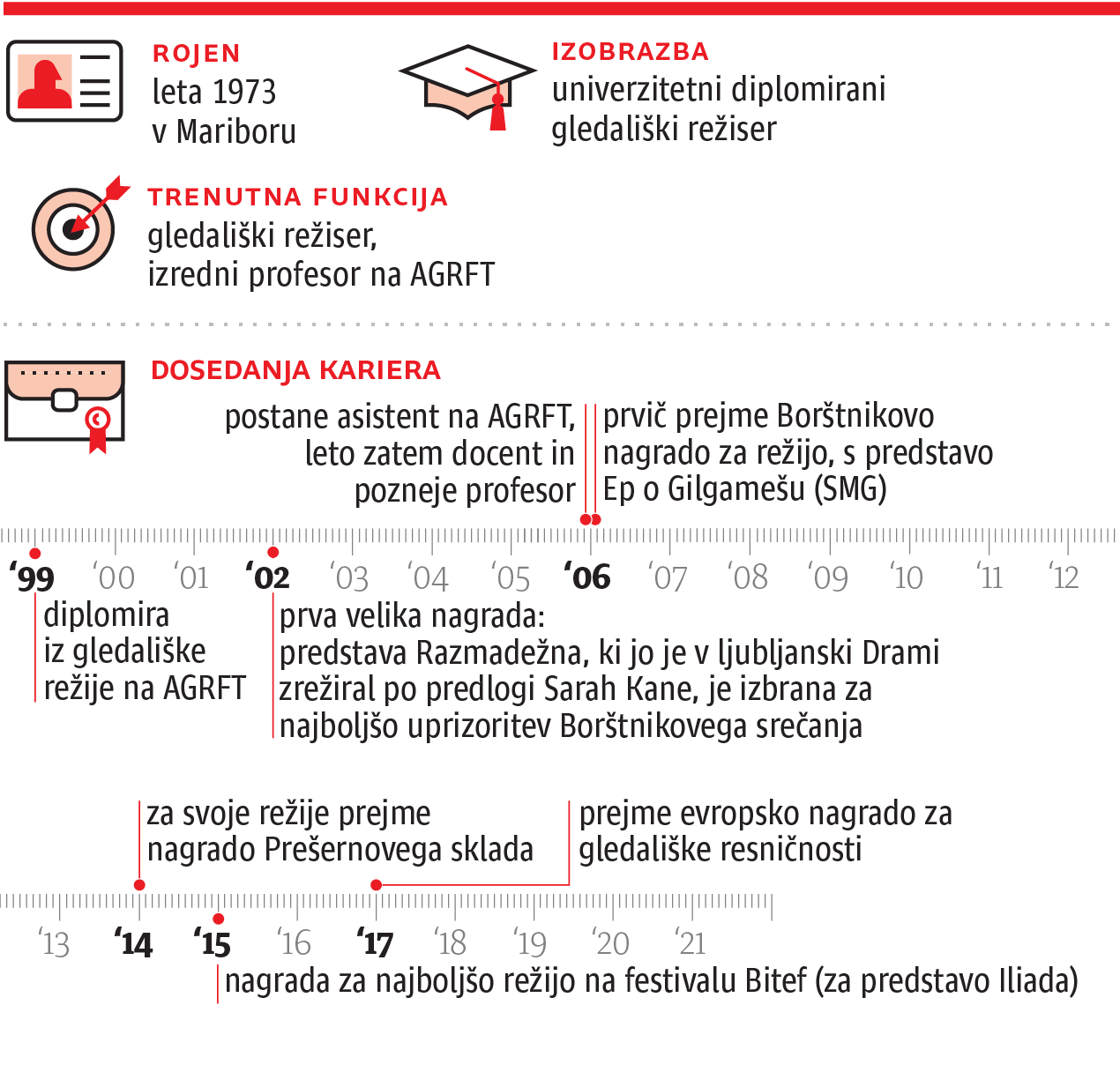 Gledališče ga je pritegnilo ob koncu osnovne šole in prve uprizoritve je režiral že v srednješolskih letih v rodnem Mariboru; le nekoliko pozneje ga je za gledališko umetnost dokončno navdušil Vili Ravnjak v Dramskem studiu. Po gimnaziji se je tako vpisal na študij gledališke režije na AGRFT, kjer je pod mentorstvom Mileta Koruna in Matjaža Zupančiča diplomiral s Sofoklejevo Antigono. Že pred tem je začel režirati v slovenskih poklicnih gledališčih: debitiral je v Drami SNG Maribor, in sicer z režijo Brechtovega Baala (1996), izkušnje si je nabiral še po drugih domačih gledaliških hišah, pa na Reki, v Zagrebu, Trstu in Sarajevu, med drugim je bil umetniški vodja Mestnega gledališča Ptuj. Že kmalu se je pokazala njegova posebna občutljivost za vse plasti gledališča – za predlogo, oblikovanje vzdušja, uporabo časa, še posebej pa za delo z igralci. Dobivati je začel tudi prve nagrade, ki se jih je do danes nabralo na desetine, tako doma kot na uglednih tujih festivalih.