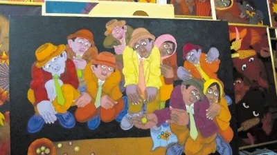 V galeriji nas je presenetilo stotero zgodb. Vsaka njegova slika je zgodba. Na primer "Povštertanc", kjer ob harmonikarju plesalec prižema plesalko s "povštrom" čez hrbet, ona ga z lopatasto roko boža po obrazu, v množici čakajočih pa na robu klopi sedi zgrbljena starka, ki z enim očesom hrepeneče motri plesalca, ali bo prišel ponjo, da bo še okusila slast že pozabljenega poljuba in plesa. Tako se od njegovega otroštva pletejo likovne zgodbe o življenju vaščanov in širše koroške okolice kot refleksije slikarjeve notranjosti.