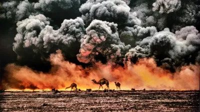 Kuvajt, prva zalivska vojna, velblodi pred gorečimi naftnimi polji. Otroška žirija je fotografijo pričujočo izbrala kot zmagovalno za nagrado world press photo.