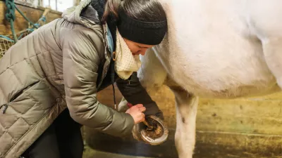 Pred jahanjem je treba poskrbeti, da je konj pripravljen. To vključuje tudi čiščenje podkev. Na sliki je Neja Ravnikar, ki prav tako sodeluje v klubu. / Foto: Bojan Velikonja