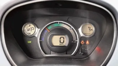Voznik in morebitni sopotnik bi se zavoljo varčevanja verjetno prehladila. Ob klimi je gretje namreč glavni porabnik elektrike. Ko je kazalo, da imamo še za 85 kilometrov toka, se je ta številka ob vklopu gretja nemudoma spustila pod 50. Osrednji merilnik nenehno prikazuje voznikovo varčnost: levi modri spodnji del polkroga kaže na polnjenje (charge - ob pojemkih in zaviranju), nad njim je zeleno varčno območje (eco), desna (siva) polovica pa zatoži voznika kot velikega potratneža.