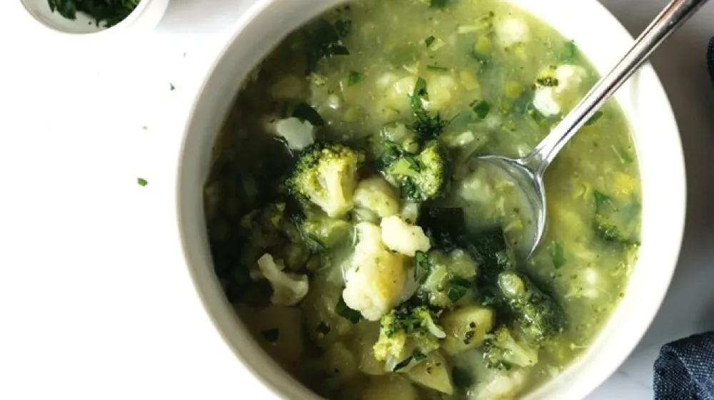 V kozici segrejte žlico olja, potem pa na segretem popražite por in zeleno. Pražite minuto, da se por zmehča, a ne obarva. V kozico potem dajte krompir in grah ter premešajte, potem pa zalijte z zelenjavno jušno osnovo. Kuhajte približno 10 minut, da se krompir že skoraj skuha. Potem v kozico dajte še cvetačo, brokoli in bučko ter premešajte in popoprajte ter kuhajte še 5 minut, da se skuhajo še cvetača, brokoli in bučka.