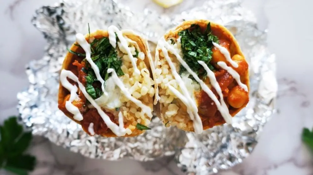 Ko imate vse sestavine pripravljene, začnite pripravljati zvitke. Tortilije segrejte, nato pa na sredino vsake razporedite bulgur, čičeriko v paradižnikovi omaki, tzatziki omako in še nekaj sesekljane mete in peteršilja.