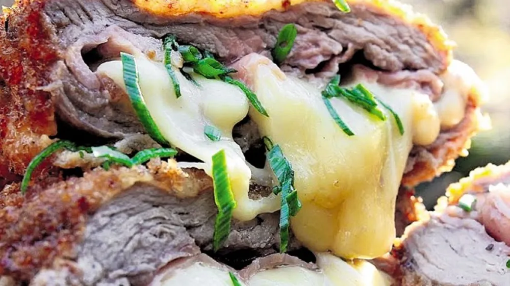 Zrezke operemo in dobro osušimo. Na voljo imamo vsaj dva načina. Če so zrezki zares debeli, jih lahko potolčemo in zarežemo v globok žep (to lahko stori že mesar). Sicer jih z obeh strani potolčemo in z ostrim nožem zarežemo do polovice (tudi to z veseljem naredi vsak dober mesar) ter razpremo kot knjigo, da nastanejo zares veliki in tanki zrezki. Posolimo jih in popopramo. Če smo napravili žepe, vsakega napolnimo s po rezino (ali dvema) pršuta in sira. Žepke zapremo in konce zašpilimo z zobotrebcem, da se med pečenjem ne odprejo. Če imamo razprte tenke zrezke, na vsakega prav tako položimo pršut in sir, in to tako, da je pokrita čim večja površina (razen roba). Takšen nadevan zrezek lahko zvijemo v rulado ali spet samo zapremo in robove zatisnemo, potolčemo ali po potrebi zašpilimo z zobotrebci. V en krožnik vsujemo moko, v drugega drobtine, v tretjem pa razžvrkljamo jajci. Polnjene zrezke previdno, da se ne razprejo, najprej povaljamo v moki, nato v jajcih in na koncu še v drobtinah. Zložimo jih na krožnik in pripravimo maščobo za cvrtje. Najboljši rezultat bo dalo cvrtje v razpuščenem maslu (tradicionalni način), ki ga lahko »razredčimo« denimo z oljčnim oljem. Resnici na ljubo takšen zrezek ne bo ravno za vreči stran, niti če ga ocvremo v navadnem sončničnem olju. Bo pa prikrajšan za nemalo žlahtnega okusa. Zrezke v obliki žepov cvremo na vsaki strani 5–10 minut (odvisno od debeline in temperature), rulado pa nekoliko dalj, ampak tudi ne predolgo, drobtine naj bodo zlato rjavo zapečene. Ocvrte zrezke odlagamo na krožnik, obložen s papirnatimi brisačami, ki vpijejo odvečno maščobo. Krožnika ne pokrivamo, sicer paniranje izgubi hrustljavost. Zrezke razporedimo na krožnike in postrežemo denimo s pečenim krompirjem in drobno nasekljanim porom. In seveda z veliko skledo solate.
