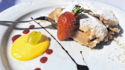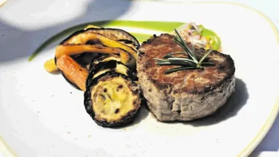 Ko govorimo o mesnih glavnih jedeh, je v prvi vrsti treba opaziti bifteke v več pojavnih oblikah. Najdražji je z istrskimi tartufi (25 evrov), najbolj iskan je kraški s pršutom in teranovo omako, mi pa smo se puristično odločili za pečenega na žaru, z nekaj popečene zelenjave in krompirjevimi kroketi oziroma kifeljci. Za 18 evrov dobite ne prevelik, toda lep in okusen kos, ki se zlahka meri s tistimi iz najboljše mednarodne ponudbe govedine po prestižnejših destinacijah v slovenskih turističnih mestih. Še nekoliko cenejša možnost je goveja tajata z rukolo in parmezanom za 16 evrov, naše omizje pa se je že oziralo za sladicami. Najbolj ponosni so na hruško, kuhano v teranu, in na orehove štruklje, jabolčni zavitek je bil povprečen, panakota z jagodičevjem pa nepretresljiva.