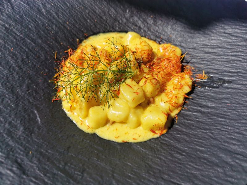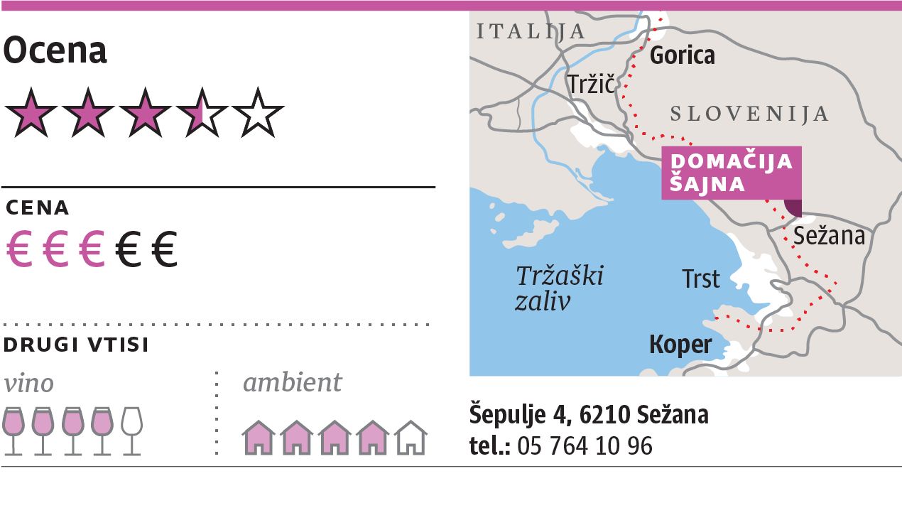 Kraške gostilne so imele včasih najpomembnejše jedi v drugi, testeninski fazi. Pri Šajni ni tako. Pokusili smo sicer izvrstne žafranove njoke s panceto, preskočili pa precej zasoljene rezance s tartufi, ki maja preprosto niso v pravi sezoni. Zato pa smo odprli steklenico Care, zanimive zvrsti chardonnayja, vitovske in malvazije, ki jo prideluje bližnja klet Štoka. Konkretno vino letnika 2013 se je ujelo s toplimi predjedmi in koketiralo tudi s težjimi mesninami – morda celo bolje kot za naše omizje vedno nepredvidljivi teran.