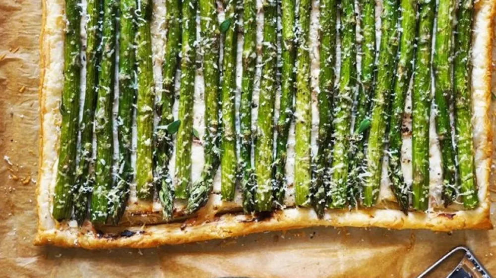 Listnato testo razvaljajte na pekač, obložen s papirjem za peko. Centimeter od roba zarežite (a ne do konca!), da naredite rob ter testo z vilico po vsej površini prešpikajte. Testo pecite 15 minut na 200°C. Skupaj zmešajte skuto, nakockan paradižnik, limonin sok in lupinico, muškatni prešček, timijan in malo soli in popra. Šparglje narežite na širino listnatega testa in jih pokapajte z oljem, potresite s soljo in poprom ter vse vmasirajte v šparglje. Pečeno testo vzemite iz pečice in pustite počivati 5 minut. Testo znotraj roba namažite s skutinovo zmesjo, potem pa nanj razporedite šparglje in vse potresite z naribanim parmezanom. Še malo popoprajte in pecite še 15 minut. Pečeno pito vzemite iz pečice, po želji še malo okrasite s parmezanom, razrežite in postrezite.