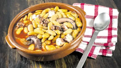 1Fižol operemo in čez noč namočimo. Zjutraj vodo odlijemo in ga v sveži vodi brez soli počasi kuhamo približno eno uro oziroma tako dolgo, da se zmehča. Hobotnico položimo v velik lonec kropa, ki mu dodamo lovorjev list in nekaj zrn popra. Pokrijemo in kuhamo približno eno uro, da se zmehča.