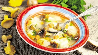 Lisičke očistimo, manjše pustimo cele, večje narežemo. Krompir olupimo in narežemo na koščke. Čebulo in česen ločeno drobno nasekljamo, korenček ostrgamo in narežemo na drobno. V večjem loncu na malo olja popražimo čebulo, da začne rjaveti. Dodamo česen. Ko zadiši, dodamo lisičke. Počakamo, da voda povre, nato dodamo korenček, krompir, sol, ščep popra in zalijemo z dvema litroma vode. Ko zavre, pokrito kuhamo 20 minut oziroma toliko, da se korenček zmehča. Dodamo timijan, kuhamo še minuto in odstavimo. Dodamo sveže nasekljan peteršilj in postrežemo.