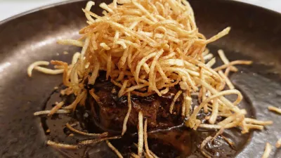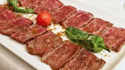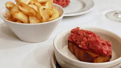 Za začetek smo se odločili za že omenjeno predstavo s tatarskim biftekom, ki ga pripravijo pri mizi, da lahko gost regulira pikantnost proizvoda. Serviran je zanimivo, na krompirjevi zloženki, po francosko pa mu priložijo še ocvrt krompirček. Ena najboljših mesnin naših krajev pa, kot večina reči v Asu, zahteva debelejšo denarnico, saj stane 18,5 evra na osebo.