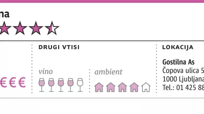 Pivnica, slovenska gostilna za turiste, italijanski lokal s picami in testeninami, bistro nekoč najboljše kuharice na svetu in fine dining restavracija oziroma gostilna As, to je trenutni zbir možnosti v ljubljanskem Knafljevem prehodu, ki pelje z bregov reke do Slovenske ceste. Nas je nazadnje zanimal As, kot mu vsi še vedno pravijo. Pred časom smo imeli kar nekaj težav, ko smo napisali, da je As zamenjal lastnike, zdaj si upamo javno reči, da je pomembna restavracija dobila novo, mlajše vodstvo, ki jedilnika ni veliko spreminjalo.