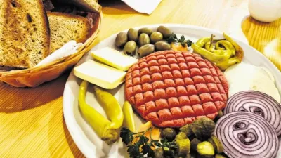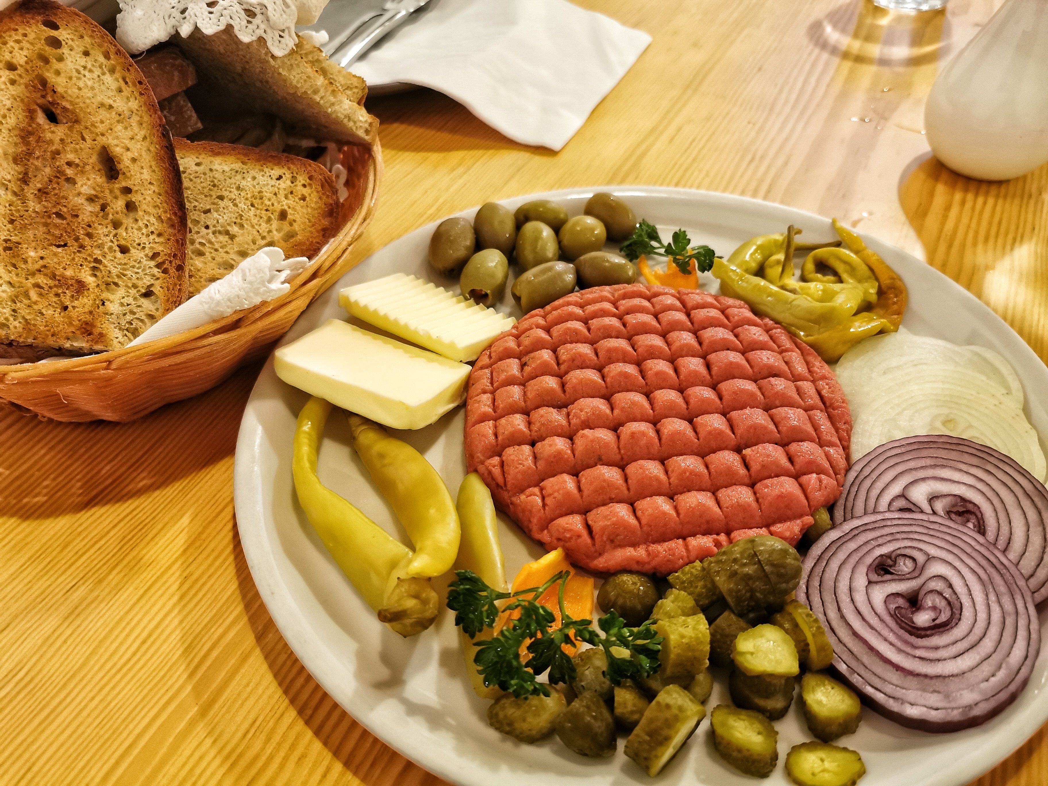 Na radiu so navijali najbolj bedne narodno-zabavne viže, to je treba reči, je pa treba tudi poudariti, da so nam na mizo dokaj hitro prinesli orjaško porcijo tatarskega bifteka. Pisalo je, da tatarec, ki stane 17,5 evra, zadostuje za dve osebi, a bi število udeležencev zlahka podvojili. Preveliko, malce premalo pikantno in preveč pašteti podobno hladno predjed so opremili z belo in rdečo čebulo ter s konfekcijskimi kumaricami, feferoni in (polnjenimi) olivami. In ko smo kepo mesa ob pomoči masla ter popečenega kruha pomlatili, smo bili že precej siti.↪️