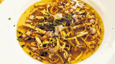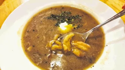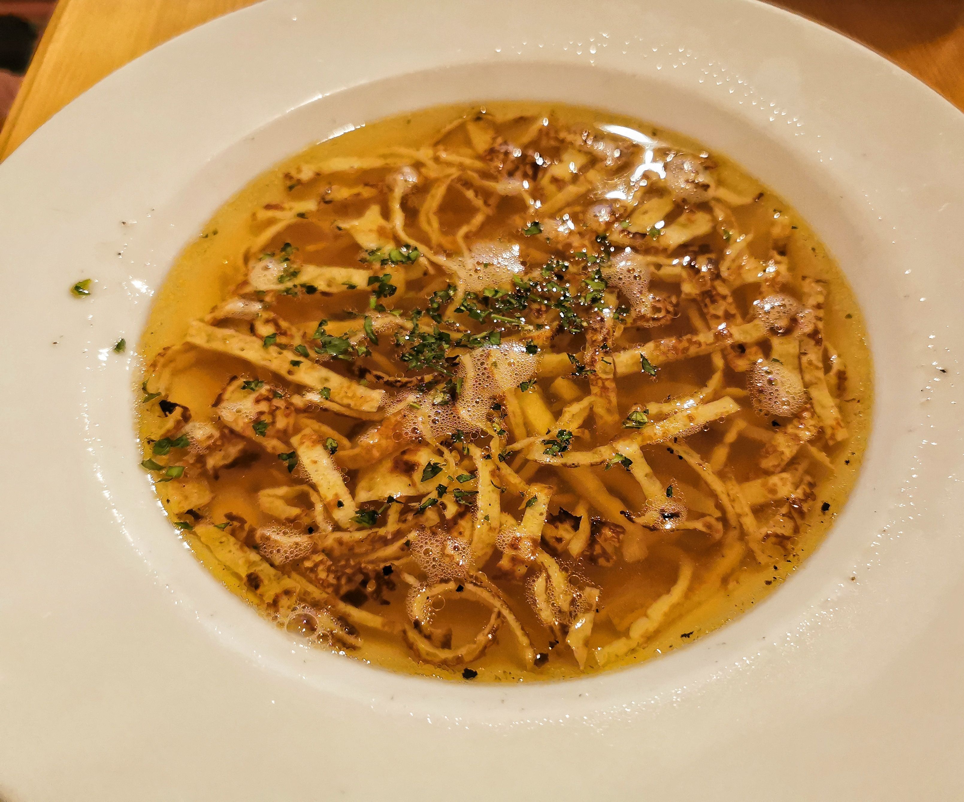 Pravzaprav ni nobenega dvoma, da je ena najboljših etap pri Šurcu goveja juha. Pripravijo jo lahko z nekaj različnimi prilogami, naš nasvet je, da jo pojeste s palačinkami (fritati), je pa res, da v takšnem primeru ne gre za lahko juhico, ampak konkreten obrok, ki za zmernih 3,5 evra zadovolji tudi razvajene želodčke. V podobnem cenovnem razredu je tudi izvrstna gobova juha (z žlico smetane), ki so jo ob paradižnikovi imeli na voljo tokrat. Mimogrede, če ste ljubitelji predjedi, ki mejijo na enolončnice, vam za visokih 12,5 evra skuhajo tudi divjačinski golaž, ki smo ga tokrat preskočili.