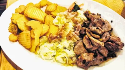 Si pa nismo mogli pomagati in smo naročili tudi eno redkih jedi, ki niso v širši ponudbi vseh domačih gostiln. Ploščo oziroma krožnik Tromeja sestavljajo trakci svinjskega fileja s praženo čebulo, krompirjev čips in zeljna solata s slanino. Ni bilo slabo, a piščanec je bil neprimerno boljši.
