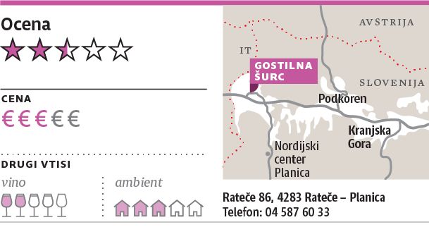 Gost, ki zavije k Šurcu v Rateče, se mora sprijazniti z nekaterimi dejstvi. Prvič, v ponudbi ni nobenega pretresljivega vina, drugič, na jedilnem listu so zgolj klasične, menda domače jedi, ki so jih mnogi slovenski gostinci posvojili po vsem svetu in jih na hitro poslovenili, in tretjič, imeti morate tudi nekaj sreče, saj stvari lahko tečejo počasi, prepočasi, še posebno če je gostov preveč, tako kot se je pred kratkim zgodilo nam.