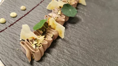 Na tisto nedeljo niti niso imeli velike izbire sladic, v bistvu so ponujali malinovo skutno torto ter kombinacijo temne čokolade, manga in pasijonke. A mi, ker smo vse preredko v teh krajih, smo si zaželeli nekaj bolj domačega. Dobili smo sladico z melodičnim imenom Hugo Wolf. Jasno, gre za poklon slavnemu (in zelo nesrečnemu) skladatelju (1860–1903), ki se je rodil v Slovenj Gradcu in je bil tako močna inspiracija kuharjem, da so z njegovim imenom podpisali orehov biskvit s karamelo, rumom, vaniljevo kremo, vaniljevim sladoledom in rozinami v rumu. Zelo sladko. Tako sladko, da smo bili več kot presenečeni, ko so nam za slovo iz kuhinje prinesli enega najlepših krožnikov – domače sladice.