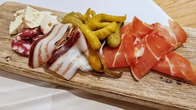 Med nekaj zanimivimi rešitvami se na začetku pohvalijo tudi z desko hladnih mesnin iz Vipavske doline (14 evrov). Na takšnem krožniku se seveda ne morete izogniti Cigojevu pršutu, krepko sušeni slanini in domači salami, zraven gre mladi sir z orehi s kmetije Hubjani iz Grgarja, za malce kisline skrbijo kumarice, neprepričljive velike olive in zelena solata.