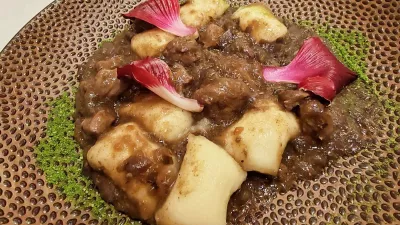 Pri toplih prvih jedeh smo preskočili juhe in se lotili testenin. Goriški polnjeni njoki z okusnim divjačinskim ragujem in, seveda, radičem so še ena od krepkih jedi pod hrastom, ki bi lahko predstavljala samostojen obrok. Enako kot ravioli s klobaso in z omembe vredno gosto omako sira in radiča. Morda so ravno to jedi, ki lahko nakažejo razliko med našo goriško kuhinjo in bližnjo furlansko idejo priprave testenin, italijanske so praviloma nekoliko lahkotnejše.