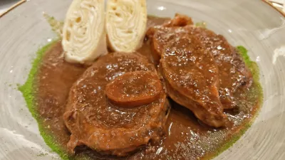 Nasitni testeninski krožniki so pri hrastu po okoli 15 evrov in podobno bogato se je naše pozno kosilo nadaljevalo. Spet velikodušno odmerjen osso buco s krepko omako, porcija je bila velika, cena pa niti ne, 21 evrov. Če je komu, ampak to bodo res redki, mesa premalo, ga spremlja še skutni štrukelj, ki je jed zapečatil.