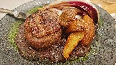 Ob vseh jedeh, ki so na dnevnem redu, smo naročili še biftek, morda zato, ker je to kar nekakšen standard za primerjavo z drugimi gostilnami, pa tudi zaradi cene (27 evrov), ki je za kakšnih 30 odstotkov nižja kot v podobnih lokalih v Ljubljani ali turističnih krajih. Kakor koli, biftek je bil tako natančno pečen, da smo kar ploskali, in čeprav je bil kos velik, so ga potrdili še s treviškim radičem in pečenim krompirjem.
