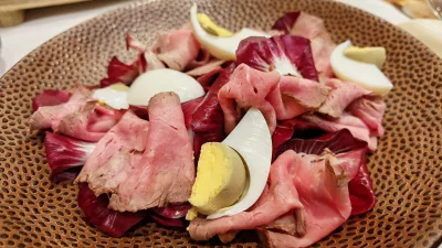 Pregledali smo nekoliko preobsežno ponudbo in se odločili, da bomo jedli predvsem sezonsko, zato smo večino jedi izbrali iz posebne ponudbe z radičem. Že takoj na začetku je na mizo prispela goriška vrtnica z jajcem in več kot zadovoljivo količino rezin rožnatega rostbifa, zaradi katere je solata postala tako konkretna, da bi lahko nastopila celo med glavnimi jedmi (15 evrov).