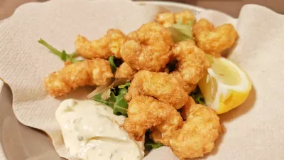 Nekaj manj je bilo škampov, ki jih ocvrejo po pariško in, zakaj pa ne, opremijo s tatarsko omako. Simpatična rešitev za tiste, ki si zaželijo kaj ocvrtega.
