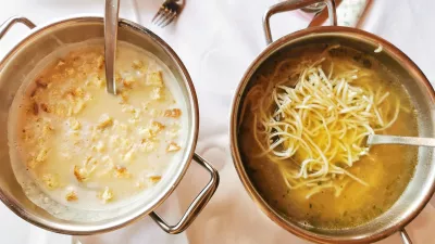 Pojdimo k hrani. Ker ni bilo hladnih predjedi, se je naš kvartet kar hitro lotil juh. V klasičnem meniju je bila na voljo goveja juha, posebno nas je zanimala česnova. Z obema so postregli v velikih jušnikih, za kakšne tri porcije na osebo. Nastala je manjša težava: juhi sta si tako različni, da ju je težko primerjati. Česnova je bila gosta, močna, krepko začinjena, goveja pa, kot vse prave, veliko bolj umirjena, morda tudi malo manj slana. V vsakem primeru smo dobili dve solidni juhi v velikih količinah, v jušnikih, ki nam ju ni uspelo povsem do konca izprazniti, tudi zato, ker smo pričakovali velike porcije glavnih jedi in prilog.