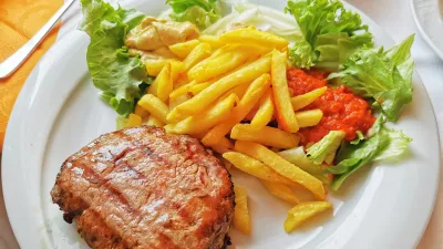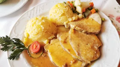 Ob bifteku so ponudili ocvrti krompir, ajvar, gorčico in čebulo, na drugi strani je, v okviru menija ena, ob praženem krompirju blestela velika porcija svinjske pečenke. Pokusili smo tudi okusen ocvrt svinjski zrezek po dunajsko, hkrati pa so v kuhinji dokazali, da je mogoče tudi v krajih, kjer je v glavni vlogi pečeno meso, povsem brez težav naročiti krožnike brez mesa. A tudi v primeru vegetarijanskega krožnika (osem evrov) ne gre za majhne količine.