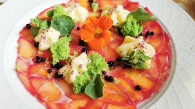 Jedilni list ni obsežen, nekaj pa je gotovo – postrvi so v glavni vlogi in na voljo v številnih pojavnih oblikah, ki se znajdejo tudi v ribjem meniju za 33 evrov (mesni stane enako). Na svojem mestu je recimo živo rdeč karpačo postrvi, ki ga najprej marinirajo v rdeči pesi, mu dodajo pomarančni gel in natrgan peteršiljev biskvit, že tako pisanemu krožniku pa pomaga še kaviar iz balzamičnega kisa. Med hladnimi predjedmi ima posebno mesto tudi zanimiva variacija italijanskega vitella tonnata. Ta se pod Krvavcem spremeni v »maiale tonnato«, s tunino omako namreč prelijejo pečeno, ohlajeno in na rezine nalistano svinjsko vratovino. Zanimiva in okusna kombinacija, ki jo podložijo z ledenko in potresejo (spet) z balzamičnim kaviarjem.