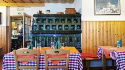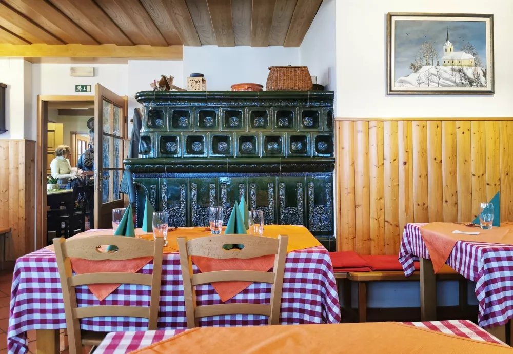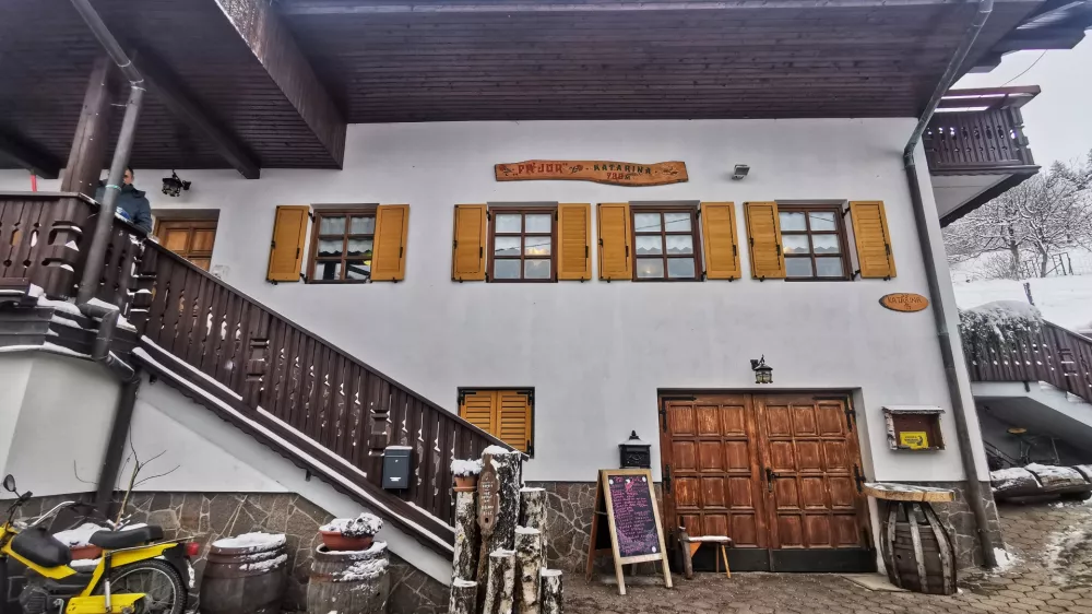 Brez rezervacij je šlo težko, kar so napovedala tudi zasedena parkirišča v okolici. Naša odprava se je znašla, avto smo, tako kot mnogo drugih, pustili sto metrov stran pri župnišču, ki za takšne nedelje očitno posoja svoj teritorij ob pokopališču in veliki cerkvi sv. Katarine. In potem smo se ob množici bolj ali manj poklicnih pohodnikov pa tudi sankačev sprehodili po zasneženi cesti do hiše, kjer že pod vhodom stoji edini jedilni list, tabla z mamljivim seznamom jedi, ki jih imajo. Od domačega tatarca do paštete, od pečenk in kolin do jote in obare, od špinačnega zavitka do prazničnih flancatov.