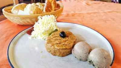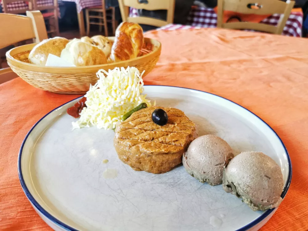 Pili smo malvazijo in jo povezali z domačo specialiteto, tatarskim biftekom (deset evrov). Porcija je velika, vsaj za dva, meso čvrsto, ne preveč pikantno, a konkretno začinjeno, v družbi so ob različnih vrstah kruha, tudi takšnem z ocvirki, maslo, paradižnik in kisle kumarice.