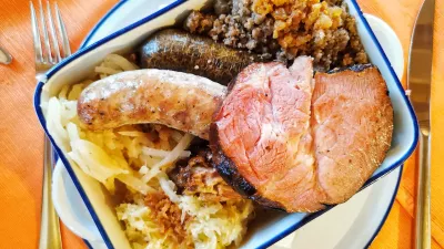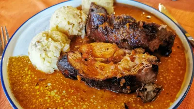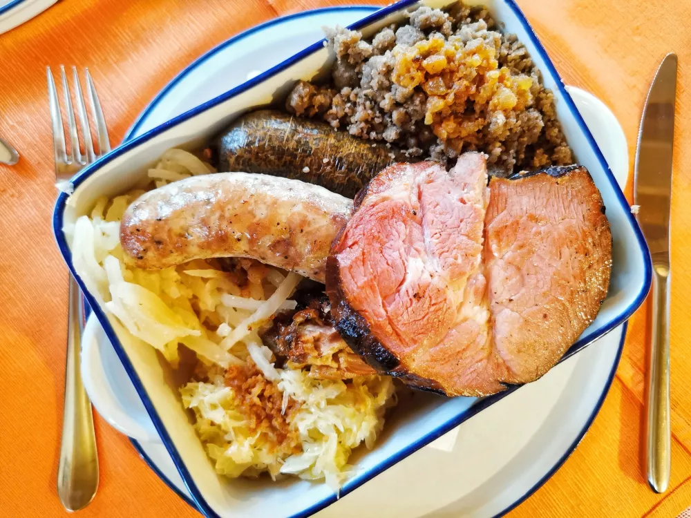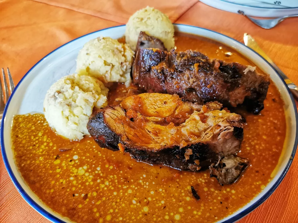 Dobro, kaj je bilo na kmečkem krožniku za 18 evrov? Nič posebnega, velika dišeča krvavica, le malo manjša čvrsta pečenica, mehka očiščena svinjska rebra in kos, kake četrt kile kuhanega dimljenega šinjka. Obrok, ki bi marsikje zadovoljil štiri lačna usta, tukaj pripravljajo za eno osebo! In to ob slastnih prilogah, ki jih ne gre prezreti. Govorimo o repi, zelju z ocvirki in seveda o žgancih z ocvirki. Je že kdo vse to tudi zares kdaj pojedel? Težko rečem, radi pa vzamejo domov, nam je povedal natakar, potem ko je prinesel še dva velika kosa telečje pečenke v gosti omaki s tremi kupčki praženega krompirja (17 evrov).