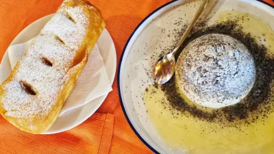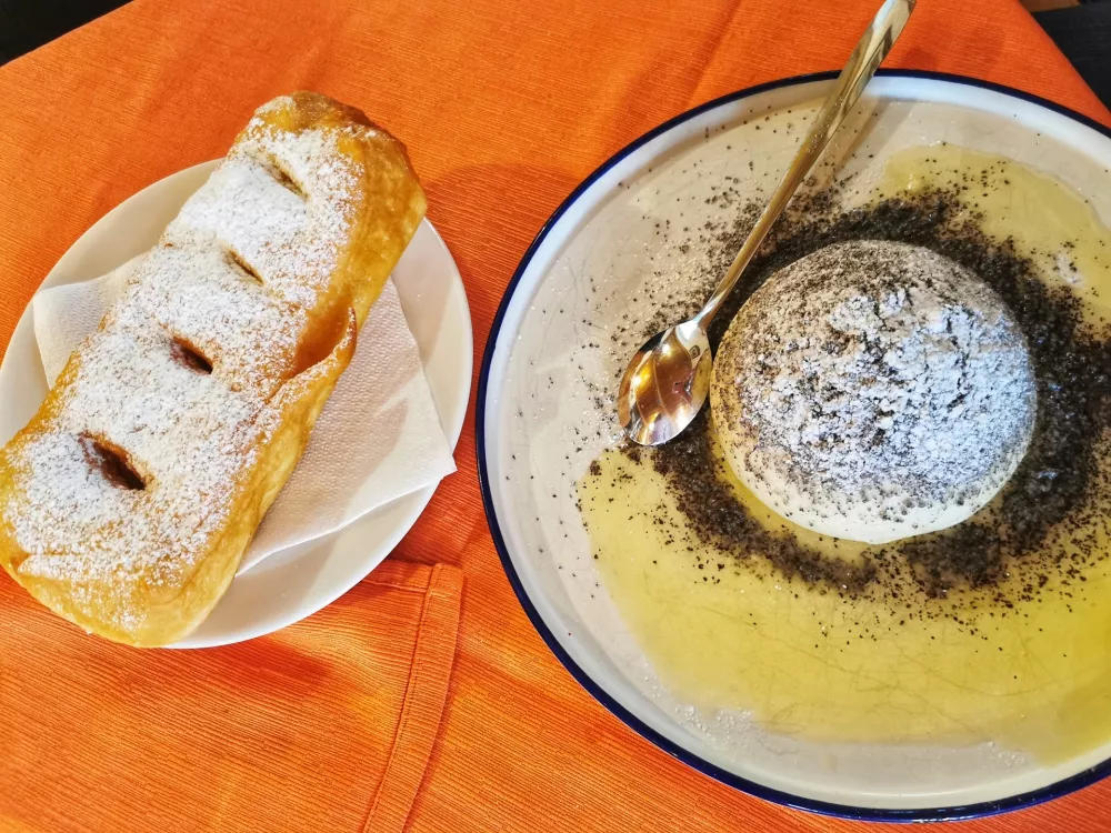 Kako popačen kulinarični jezik govorimo Slovenci, ko se udeležimo nedeljskih kosil, kot je bilo tole zimsko na Katarini, se je videlo pri sladicah. Imamo štrudlje, germknedle in flancate, so povedali. A priznajmo si, prevod niti ni potreben. Lahko pa povemo, da tako velikega flancata (1,80 evra), kot smo ga dobili na Katarini, še nismo videli. In ga morda ne bomo nikoli več. Kandidat za Guinnessovo knjigo rekordov je bil povrhu vsega še slasten, kljub velikosti smo ga zlahka snedli. Nič manjši ni bil makov cmok, ki so ga bogato napolnili s slivovo marmelado in nastala je ena najzanimivejših sladic v ljubljanski okolici.