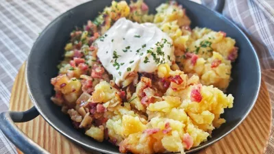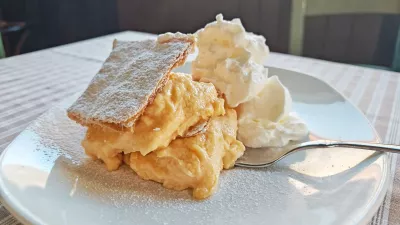 Kakor koli, vršiška kremšnita za lepih pet evrov je bila verjetno najboljša jed našega kosila. Gorenjska klasika je v teh krajih malce obrnjena, smetana namreč nastopa kot priloga, jajčna krema pa je bila med bolj slastnimi, kar smo jih kdaj jedli.