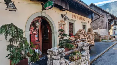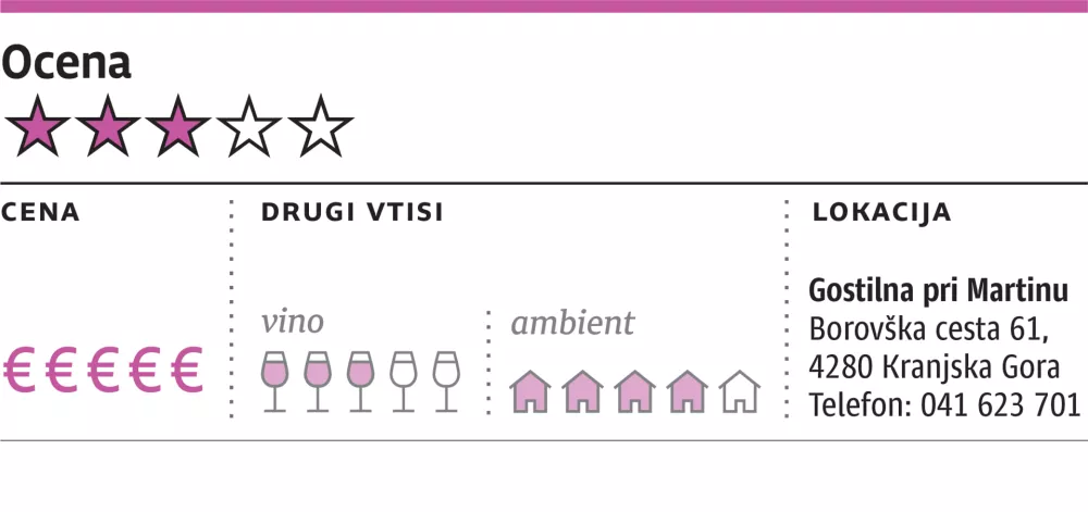 Gostilna pri Martinu je zunaj po avstrijsko vabljiva, v notranjosti pa malce manj. Prostora imajo za kakšna dva večja avtobusa, zunaj pa imajo, in to v Kranjski Gori šteje, velik, celo zelo velik parkirni rajon, ki najverjetneje privabi tudi manj športno publiko. Martinovi so v prvi vrsti še vedno podpora domači smučarski postrežbi in imajo konkretno ponudbo piva in žganic, lahko pa se pohvalijo tudi z vinsko karto. Na začetku imajo Isteničevo in Puklavčevo penino, za 32 in 38 evrov, nadaljujejo s kletmi Ščurek, Vipava 1894, Dveri Pax in Jakončič ter celo s Šturmom in Prusom. Mi smo popoldne preživeli s steklenico bogatega in dišečega chardonnayja bagueri iz Kleti Brda za 32 evrov, kar je malce predrago, če vemo, da ga je v maloprodaji mogoče dobiti že za manj kot 15 evrov, a pustimo podrobnosti in se lotimo predjedi.