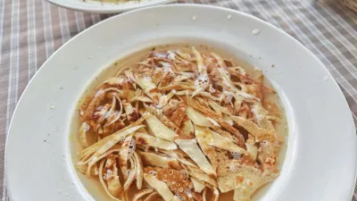 Ko smo končali prvo etapo in pribor odložili na krožnike, je sledilo manjše pojasnilo: tega boste pa še potrebovali. Gost je torej deležen le enega kompleta pribora, kar je super, saj radi mešamo okuse: ostanki fete in oliv bodo šli lepo h krvavici, smo hoteli reči, a smo se raje ustavili in napadli govejo juho s fritati, h kateri smo celo dobili žlico. Bila je prava predstavnica gorenjske kuhinje, a je je vsaj polovico manj kot v gostilnah okoli Ljubljane, pa še mlačna je bila. So jo ohladili že pripravljeni fritati ali pa je pot iz štedilnika do mize enostavno trajala predolgo? Na drugi strani je bila mnogo toplejša ali že kar vroča česnova predstavnica napitkov, ki ni kremna, ampak česen dejansko narežejo na rezine, kar se potem pozna pri okusu.