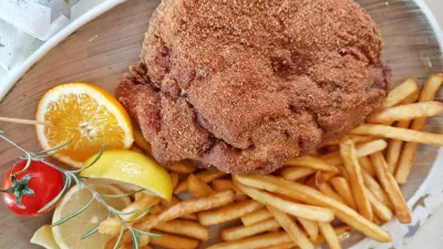 Za najobilnejšo jed se je izkazal s sirom in šunko polnjen telečji zrezek (cordon bleu), ki ga skupaj s pomfritom, solato, juho in sladico prodajajo za 17 evrov. In ga je tudi težko kar tako pojesti; najvztrajnejši pri naši mizi se je boril kakšne pol ure in mu ga je na koncu uspelo pokončati. Le nekaj manj je bilo ocvrtega puranovega zrezka, za 13 evrov, ob vseh dodatkih.