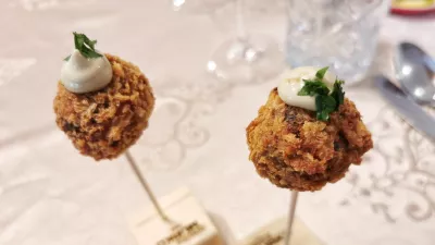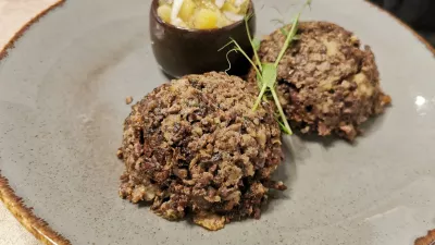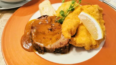 Aha, kaj je »ta pravo domače kosilo«? V našem primeru sta bila to ocvrt puranji zrezek in svinjska pečenka. Za prilogo so postregli praženi krompir in skutni štrukelj, da o veliki mešani solati z jajcem niti ne govorimo. Veliko, a je treba jasno povedati, da mežerlov ni bilo nič manj. Dve veliki kepi manj popularne svinjske drobovine, tradicionalno povezane z mastjo, jajcem, čebulo in še čim. Če še niste pokusili, morate.