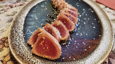 Velikemu dela omizja so najbolj ugajali nenavadno učinkoviti, sladko-kisli inčuni z malo rdeče čebule in limone, ki so napovedali konkretnejše jedi. Še preden smo se spet potopili v jadranske globine, smo izvedeli, kateri so trenutno najboljši v deželi cvička, in ugotovili, da imajo letos polno klet Cvelbarjevega cvička. Po krajši degustaciji smo se strinjali, da sploh ni slab in – to se bo sicer slišalo poceni – povsem znosno se je spoprijel s tatakijem tune, največjim in najboljšim, najčistejšim in najenostavnejšim, ki smo jih pokusili v zadnjem času.