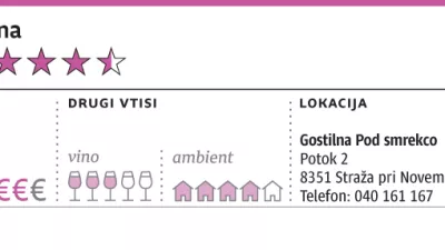 Gostilna Pod smrekco, če odmislimo notranjo opremo, je podobna koprski Salicornii. Pri receptih je nekaj manj kreativnih zamisli, po drugi strani pa je pri samih sestavinah več možnosti. Tudi nekoliko cenejši se zdijo, a je jasno, da prave jadranske ribe niso poceni niti na Dolenjskem. In od kod pridejo tako prestižne delicije? Oče ima na Pašmanu dve barki, drugače pa je žena z Brača, dol imamo tudi nekaj oljk, je bil informativen šef in po penini natočil pitno, ne pretežko Colnarjevo belo zvrst collis, da smo vsaj z vini še nekaj časa ostali na domačem terenu.