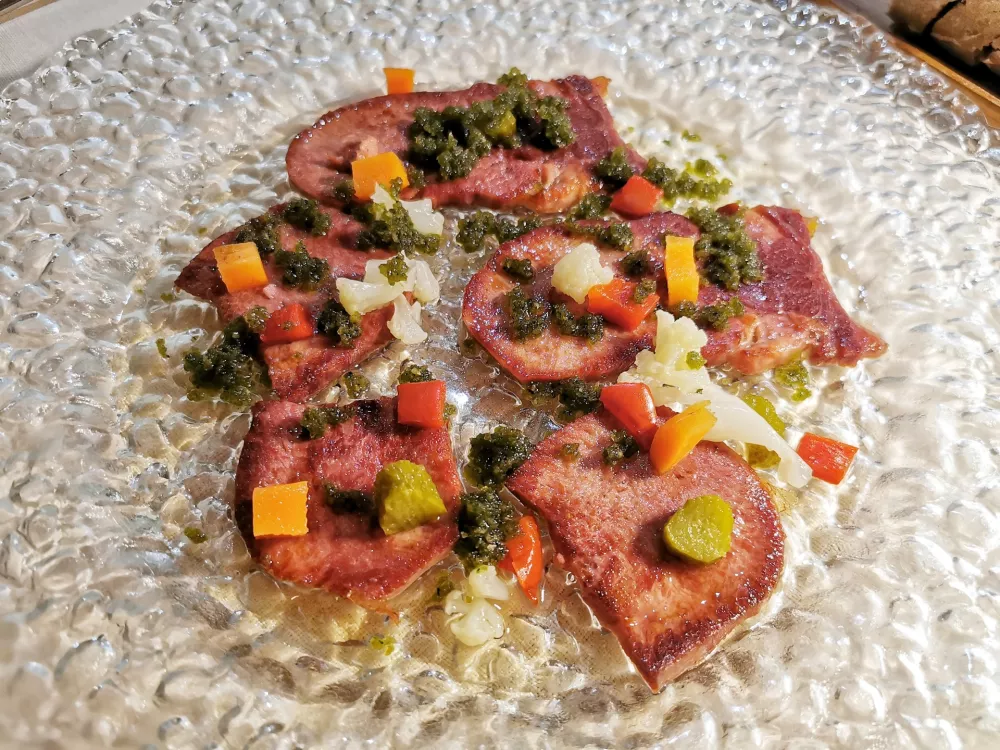 Pri Ronchi Rò ne iščejo prestižnih mesnin z drugih celin, ali bog ne daj, kaviarja, kakor to vidite na naši strani Brd. Ob zvrsti tokaja in sauvignona ali hišnem merlotu (šest evrov) postrežejo s telečjim jezikom. Pri nas ga navadno jemo kot hladno predjed, na gričih Collia so rezine popečene, zraven gredo peteršiljeva omaka, okisane paprike, kumarice, cvetača in korenje, jed pa na koncu prelijejo še s kapljico goveje juhe (14 evrov).