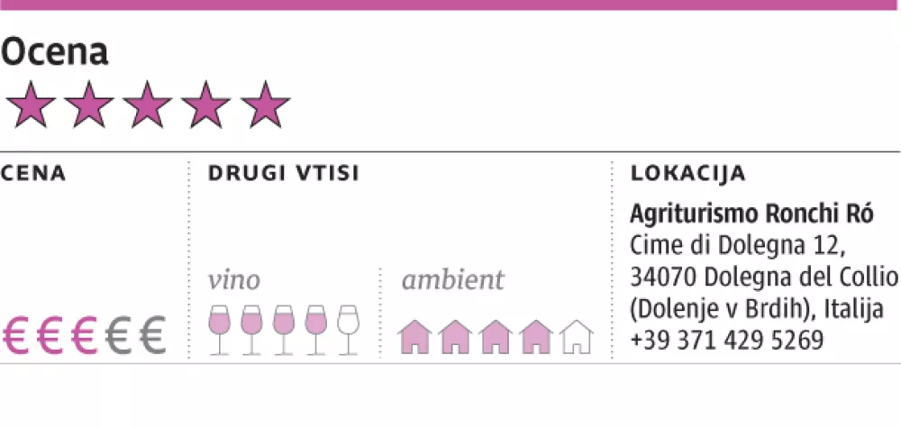 Kar nekaj časa so nas poznavalci briške kulinarike in vin opozarjali na turistično kmetijo Ronchi Rò v Dolenjem, tik ob slovensko-italijanski meji. Ronchi Rò je nepretenciozna in prijazna hiša med vinogradi, kjer pridelujejo svoje vino, ponujajo velike, čiste in zelo natančno urejene sobe, ves dan nekaj strežejo, kadar je lepo vreme, tudi na dvorišču. Imajo prijaznega, malce slinastega psa ter vseprisotnega gospodarja in kuharja v eni osebi, ki vneto vozi slalom med mizami in kuhinjo. Na posestvu strogo poudarjajo naravne, ekološke ali trajnostne zapovedi, a to ne vpliva na počutje, kot se v takšnih primerih rado zgodi pri nas.