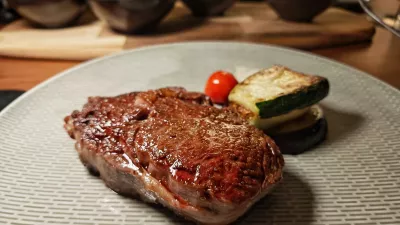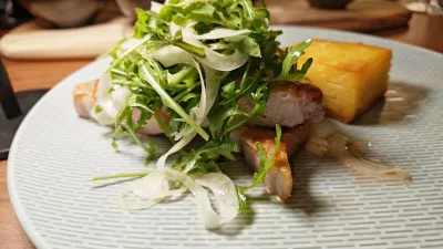 Rib eye in zarebrnica krškopoljca sta bila skupaj s prilogami tudi likovni vrhunec večera, je pa treba reči, da se bomo težko navadili, da je (niti ne zelo prestižna) govedina s ceno 40 evrov v Ljubljani postala nekakšen standard. Ne bomo spet o Italiji, a pred kakim mesecem smo podobno meso jedli praktično pol ceneje, in to v restavraciji, ki se na svetovnih zemljevidih uvršča neprimerno višje kot ljubljanska gostišča. Vseeno, rib eye je bil izvrsten, zloženka jajčevcev, bučk in koromača pa ena najboljših zelenjavnih prilog, ki smo jih pokusili v zadnjem letu. K mesu so v ločenih posodicah priložili še poprovo in vinsko omako ter pire in pečeni krompir, ki sta sodelovala tudi pri slastni zarebrnici krškopoljca s krompirjevo zloženko in kombinacijo rukole ter koromača (28 evrov).