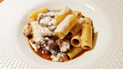 Kljub francosko-italijanskim vplivom v kuhinji smo si tokrat privoščili vino iz španskega Priorata. Perpetual 2019 družine Torres je rdeč silak, ki ga je v Klasu mogoče dobiti razmeroma poceni. Računali smo, da se bo lepo ujel z glavnimi mesnimi jedmi, a so se z njim strinjali že rigatoni, ki jih spremlja zmehčano, neizmerno okusno meso z govejih reber. Simpatično. Bolj eksotična, a nič manj okusna je bila rižota s kremo korenja in ingverja, ki jo na plitvem krožniku popestrijo kozice in nduja. Obe topli predjedi staneta po 24 evrov, lahko pa se dogovorite tudi za manjše in nekoliko cenejše porcije.