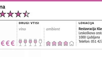 Klas v Leskovškovi ulici pravzaprav ni bistro, čeprav kaže tudi nekaj elementov enostavnejše kuhinje, je hitro jasno, da ga zanima bolj bogata kuhinja, podobna, kot smo je bili navajeni v Maximu, nasproti državnega zbora. Če želite še kakšno podobnost, v osnovi so zelo blizu vse bolj razkošnemu Cubu in tudi v tem primeru je očitno, zakaj, saj njihove recepte oblikujejo elementi klasične, prestižne italijanske kuhinje. Tako kot pokojni Maxim in popularni Cubo je tudi Klas, kot pravijo usposobljeni, restavracija visokega cenovnega razreda, kar pomeni, da boste za večerjo, podobno, kot smo jo pred kratkim pojedli mi, plačali okoli 100 evrov na osebo. Pri vinih pa boste morali še posebno paziti. Kar ni lahko, pri Klasu imajo sicer ne preširoko vinsko karto, na kateri pa je kar nekaj biserov. Tudi na kozarec se najde marsikaj, od šampanjcev do bogatih rdečih vin.
