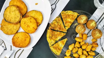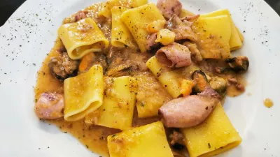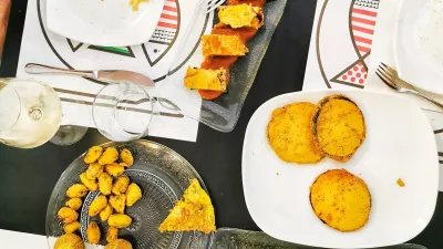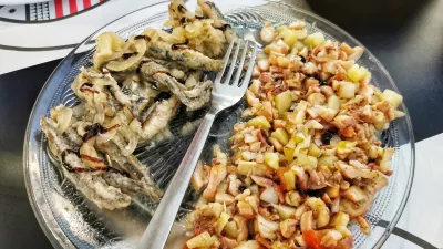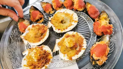 Nato se na mizi zvrsti cela serija biserov, recimo hobotnica v solati in sardoni na šavor, pa obilne kepice nežnega bakalarja na kockah pečene polente. Za zelenjavni del poskrbijo z dvojnim ali trojnim odmerkom na tenko narezanih in ocvrtih jajčevcev, za primorsko klasiko ponudijo dišečo frtaljo z zelišči in inčuni. Ne, to še ni vse: kaneštrele in pedoče vzorno gratinirajo, zavitek napolnijo s tuno, rikoto in zelišči ter podložijo s paradižnikovo omako. Da ne pozabimo: za vsakega je bila še ocvrta ribja kroglica ali polpet, če hočete, za poznavalce pa so bili na zadnjem krožniku tudi ocvrti pedoči, po naše klapavice.