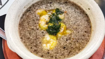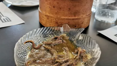 Osvežilna Etika se je srečala s kar enajstimi predjedmi, ki bi bile marsikje v Sloveniji zlahka dovolj za pošteno kosilo. Naj opišemo, kaj smo za začetek dobili na mizo: sardone potresejo z mletim koromačem in prelijejo z oljčnim oljem, da nastane povsem preprosta, a neverjetno okusna in učinkovita kombinacija. Spremlja jo zelo mehak, skoraj puhast primorski kruh v obliki velikih polžkov.