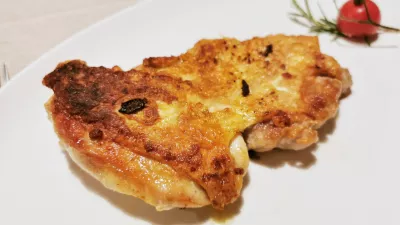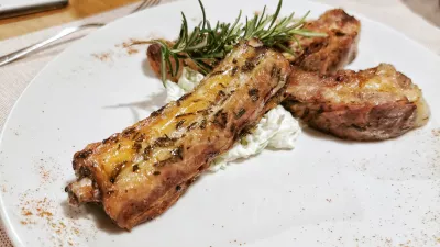 Še eno res veliko presenečenje je bil Lupinčev teran, na italijanski strani je bolj mehak kot na naši, ki prijetno pospremi mesnine. Tudi mehka, počasi pečena svinjska rebrca (18 evrov), ki jih podložijo z grškim tzatzikijem oziroma kumarami v jogurtu. Lupinčev dišeči teran je šel tudi k hrustljavo pečenemu piščancu z rožmarinom, medtem ko so štiri kose enostavno ocvrtega piščanca, podobno kot jih ob nedeljah cvrejo po Sloveniji, opremili s tatarsko omako in majonezo s paradižnikom. Velike porcije piščanca v obeh oblikah stanejo 16 evrov, treba pa je vedeti, da se priloge naročajo posebej. Mi smo bili v tej fazi že vse prej kot lačni, zato smo mesu dodali le porcijo dušene cikorije.